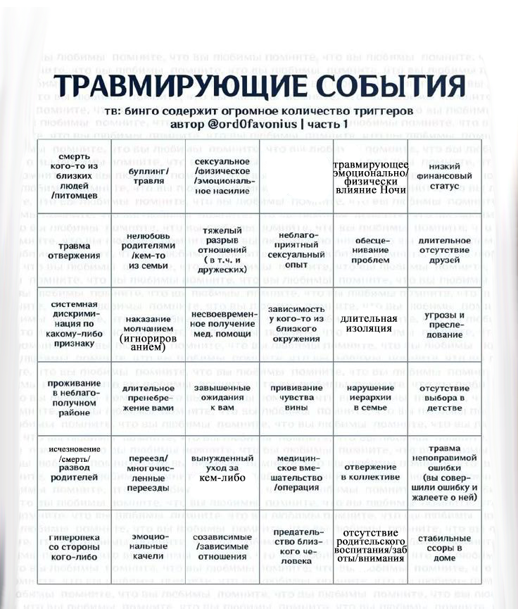3. Опишите то, как персонаж спит. Спит солдатиком, чтобы меньше места занимать, потому что иногда ночью к Сириусу приходят спать братья, если им снятся кошмары, и ложатся рядом. 4. Как персонаж выглядит, когда дремлет? Помните как Лелуш в коде гиасса сидел, чуть склонившись вперед и прислонив ладонь ко лбу? Словно сидит и думает. Блин, вот также. Если не знаешь, то никогда не поймешь, что Сириус спит. 5. Как персонаж выглядит, когда только проснулся? Собран и готов к происходящему. Так как многие годы спать Сириус нормально не мог, потому что в любой момент его могли прибить, то привык спать чутко и сразу же, проснувшись, быть готовым к тому, чтобы дать по тапкам или по зубам. 6. Есть ли что-то, что персонаж хочет поменять во внешности? Избавиться от шрамов. 7. Какой у персонажа цвет глаз? Золотой. 8. Есть шрамы? О даааа. 9. Есть ли у персонажа акцент? Есть временами довольно сильный провинциальный говор. 10. Как персонаж ведет себя, когда счастлив? Улыбается, прикрыв глаза. 11. Пытается ли персонаж скрыть свои эмоции? Насколько он в этом хорош? Мастер на все руки. Разыграет перед вами любую эмоцию, начиная от горьких слез и заканчивая злобным хохотом. Эмоции не скрывает, но мастерски их имитирует. 12. Персонаж высокий или низкий, или что-то между? Высокий. 13. У персонажа хорошее зрение? Да. 14. Персонаж чистоплотен? Да. 15. Какая у персонажа комплекция тела? Спортивный. Бог Аполлон. Личность 16. Что у персонажа является самой большой мотивацией? Счастье братьев. 17. Страдает ли какими-либо ментальными заболеваниями? Наверное, но Сириусу похер на свою голову. 18. Как персонаж реагирует на чувство вины? Если виноват перед братьями - исправится и загладит вину. Если перед важными знакомыми - тоже. Остальные идут лесом. 19. Есть ли вредные привычки? Угрожает людям, иногда их калечит и убивает. 20. Мечты? Чтобы братья перестали есть мозг чайной ложкой хотя бы день. 21. Страхи? Потерять свою названную семью. 22. Религиозен ли персонаж? Нет. 23. Каков темперамент у персонажа? Сангвиник. 24. Персонаж счастлив в настоящий момент? Да. 25. Персонаж скорее неряшлив или скорее организован? Организован. 26. Легко ли персонажа разозлить? Как он выглядит, когда теряет самоконтроль? Достаточно легко. Сидит, хищно улыбается и смотрит так, что кровь в жилах стынет. 27. Насколько персонаж терпелив? По отношению к каким-то достижениям или получению результата - очень, но вот по отношению к людям нет. 28. Персонаж надежен? Да. 29. Нравится ли персонажу, как он выглядит? Скорее да, чем нет. 30. Считает ли персонаж себя привлекательным? Скорее да, чем нет. 31. Какое у персонажа чувство юмора? Как у провинциального гопаря. 32. В каком настроении персонаж чаще всего пребывает? Хмуром. 33. Взгляд на жизнь? Считает, что всего в жизни может достичь и получить. 34. Какие вещи делают персонажа грустным/вводят в депрессию? Резкая боль в спине, ногах или руке. 35. Какая у персонажа самая слабая сторона? Резкость. 36. Какая у персонажа самая сильная сторона? Жертвенность (по отношению к братьям) 37. Персонаж что-нибудь коллекционирует? Шрамы себе на спину. И прозвища от братьев. Биография 38. Когда день рождения персонажа? 7 ноября 39. Самое смущающее воспоминание? Первый поход к проститутке. Типа Сириус и секс как бы могут существовать в одной плоскости, но по факту из-за стресса и работы - нет. Так вот, как сходил, так и ушел, потому что проститутка п