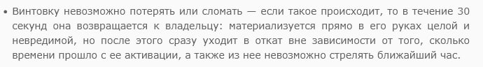 Винтовку невозможно потерять или сломать — если такое происходит, то в течение 30 секунд она возвращается к владельцу: материализуется прямо в его руках целой и невредимой.